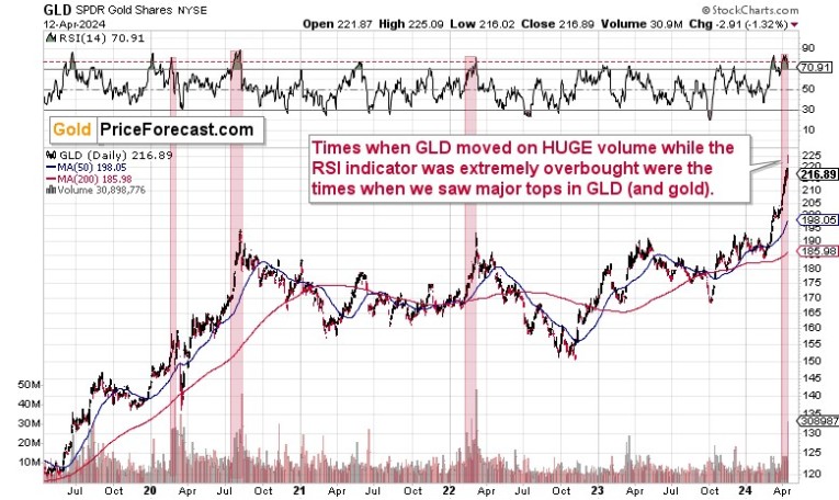 I marked those periods on the above GLD ETF chart with red – when RSI based on the GLD was over 80 AND we saw a huge spike in the levels of volume, it meant that the big rally in gold price was over.