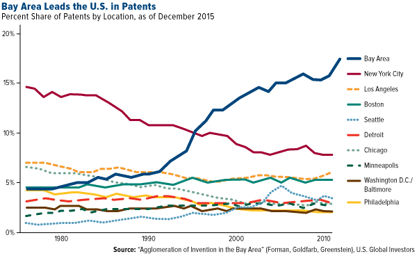 San Francisco—and its fellow Bay cities San Jose, Oakland, Mountain View and others—is ground zero for American innovation. Taken as a whole, the Bay Area has far and away the most patents than any other American city, after surpassing New York City in 1995. It grew from contributing only 4 percent of U.S. patents in 1976 to 16 percent by 2008.