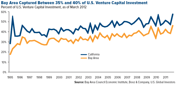 The Bay Area also leads the nation in the amount of venture capital that pours in every year. A study conducted in 2012 by the Bay Area Council Economic Institute and Booz & Company found that the region, where most Silicon Valley companies are headquartered, attracted between 35 and 40 percent of all U.S. venture capital investment. Much of the investment focused on information technology, biotechnology, internet, digital entertainment and “cleantech” firms.