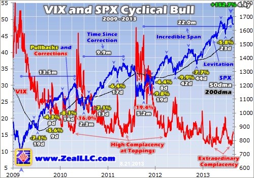 One of the primary reasons a material selloff is so overdue today is the remarkable lack of them since mid-November 2012 when this year’s relentless levitation was born. During the 9 months since, there has only been one pullback and zero corrections. As this first chart shows, this is very anomalous. The longer a bull market goes without a material selloff to rebalance sentiment, the more precarious it gets.