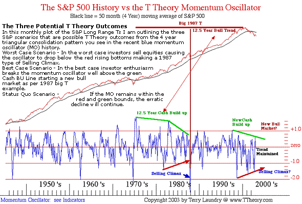 While we are awaiting the resolution of the S&P 500 T Theory picture below I thought it worthwhile to speculate on the possible outcomes that are allowed by T Theory and have been demonstrated reliable projections for the past 200 years in my longest term work. See the Mega-T concepts posted online for details. The monthly chart below is up to date as of February 28 2003 and will get potentially significant new data if war erupts in the days ahead. There are three scenarios as noted in the chart; the continuation of the status quo ( 3 year erratic decline), a market collapse or a new bull market T formation.