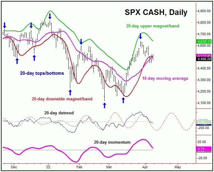 Going further with the above, from the March 29 peak, it was the March 31st reversal below the 4578.16 SPX CASH figure which actually confirmed the correction phase of the 10 and 20-day waves to be back in force. From the break below this downside reversal point, the index has fallen another 128 points into the most recent swing low.