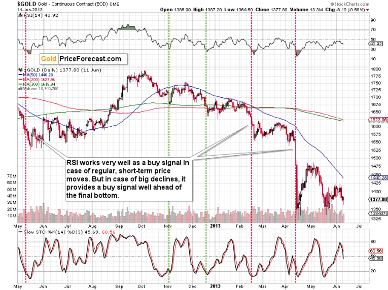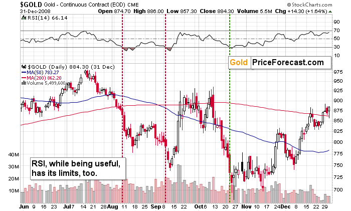 In case of big price declines in gold, looking at RSI alone might make one make wrong trading decisions. The same goes for other techniques that focus on short-term price moves.