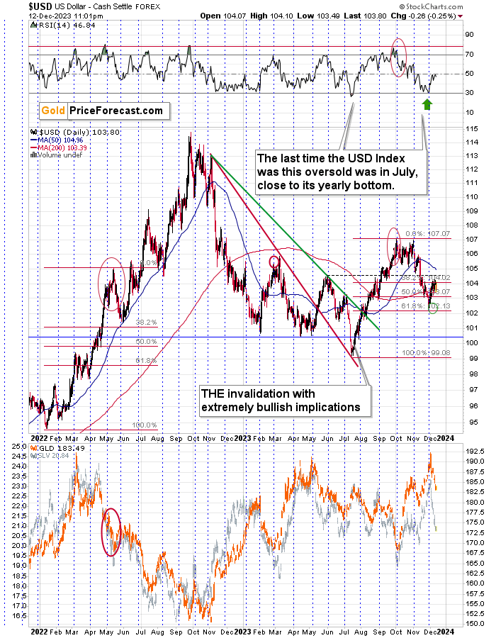 The above happened while the USD Index moved a bit lower! If gold wasn’t strong enough to invalidate the breakdown with USD’s help, then it’s clear that gold really wants to decline further.