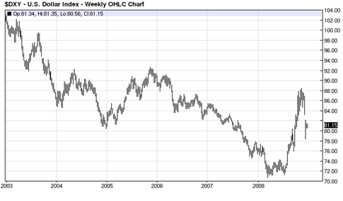 Today we actually have the reverse scenario: the dollar index is rising as the yen and euro currencies are falling. The carry trade is to borrow (short) the yen and euro and buy higher-yielding dollar-denominated assets. Therefore, the next economic collapse will reverse this carry trade.