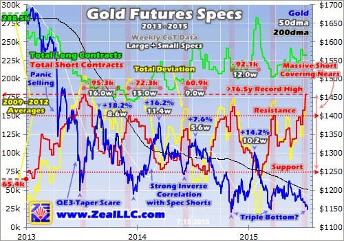 The WGC’s latest figures showed average global investment demand in gold of 92.9t per month in the first quarter of 2015. So for the several months it takes to unfold, American futures speculators’ short covering alone will increase worldwide gold investment demand by an amazing 116%! This will fuel a sharp gold rally as always. At the recent-year average of 16.2%, gold would surge to $1335 in 10 weeks.