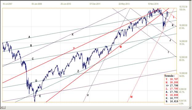 The new rally, off line W (16868), broke clear above lines B (16619) and K (16777) and also above line A (17741), to reach and hold at resistance at line L (17795). At first it reversed steeply lower, only to repeat what has happened so often after such a sell-off – a rally as steep as the sell-off was. The new rally could not break above line L and held there through the shortened week to close right at resistance.