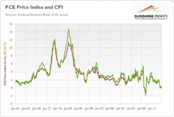 As one can see, there is a similar relationship as with CPI. The shiny metal is not an effective hedge against inflation measured by PCEPI or its core version for short- and medium-term horizons. The price of gold was declining in the 1980s and the 1990s, although the inflation rate at the time was positive. However, there is a relationship between the price of gold and the acceleration and deceleration of the inflation rate. Indeed, the gold prices were increasing in the 70s, when the inflation rate was high and accelerating. Respectively, they were decreasing in the 80s and the 90s when the inflation rate was declining. The very same link to gold should not come as a surprise if we realize that PCEPI shows very similar dynamics to CPI (see the chart below).