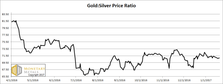 Next, this is a graph of the gold price measured in silver, otherwise known as the gold to silver ratio. It fell a bit this week.