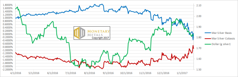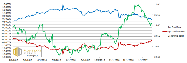 For each metal, we will look at a graph of the basis and cobasis overlaid with the price of the dollar in terms of the respective metal. It will make it easier to provide brief commentary. The dollar will be represented in green, the basis in blue and cobasis in red.