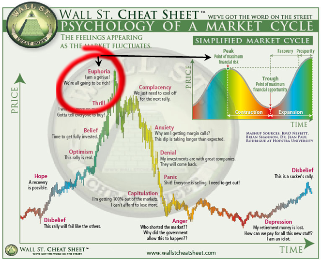 When a couple large institutions decide to start distributing shares in fear of a market top their combined actions will eventually trigger panic with other large firms who will then also want to unload their shares before it’s too late. This is what triggers the first massive move down in price right after the Euphoria stage, thus neutralizing the upward bias in stocks. This help us know when we should change our investment positions and strategies going forward.