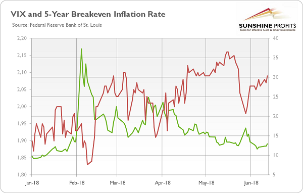 However, there is another possible explanation: with the Fed’s hike behind it, gold investors look now at heightened market volatility and rising inflation explanations (see the chart below, which paints the CBOE VIX index and the measure of a measure of expected inflation derived from 5-Year Treasury Constant Maturity Securities and 5-Year Treasury Inflation-Indexed Constant Maturity Securities). Both of them have been rising in June.