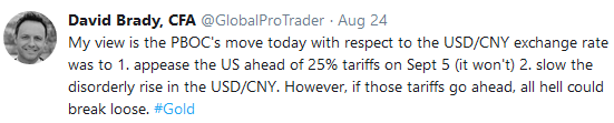 Two things were clear. First, USD/CNY was still clearly driving the gold bus. Second, the failure of the talks, with no schedule for future discussions, meant that the additional 25% tariffs on 40% or $200bln of Chinese exports to the U.S. were still due to go into effect on September 5 th. If there is no postponement or cancellation of these tariffs, then USD/CNY is likely to go higher again and break the key level of 7, regardless of the counter-cyclical factor. This would send gold down to new lower lows. For this reason, I call this D-Day for gold.