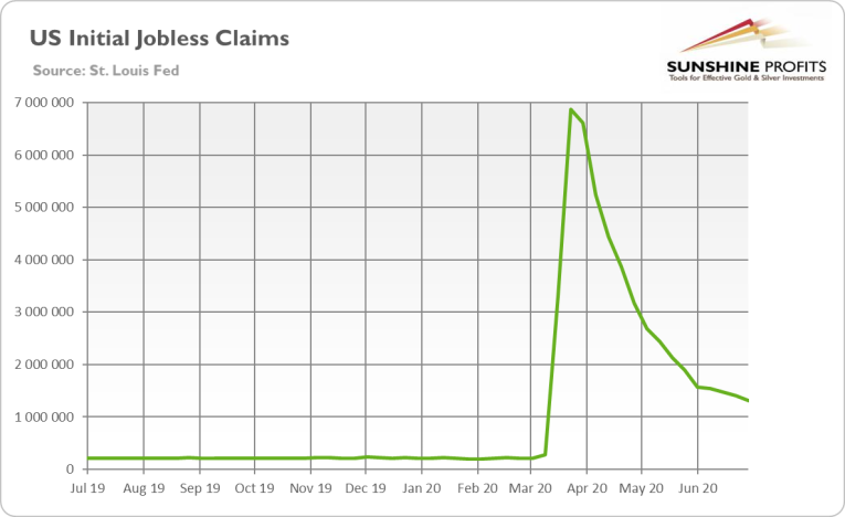 The spike in in the U.S. infections triggered worries about fresh lockdowns in America and the breakdown of the already fragile economic recovery. Justified worries – data shows that U.S. consumers reduced their visits into shops in the most infected regions of the country. Several other indicators also suggest that economic recovery slowed down or even stopped at the turn of June and July, partially because of the new outbreaks of the coronavirus. If the resurgence is not contained quickly (for example thanks due to wearing masks), the economic recovery will slow down or even collapse. And although the initial claims fell down further to 1.31 million last week, beating market’s expectations, they have been falling very, very slowly, as the chart below shows.