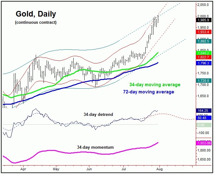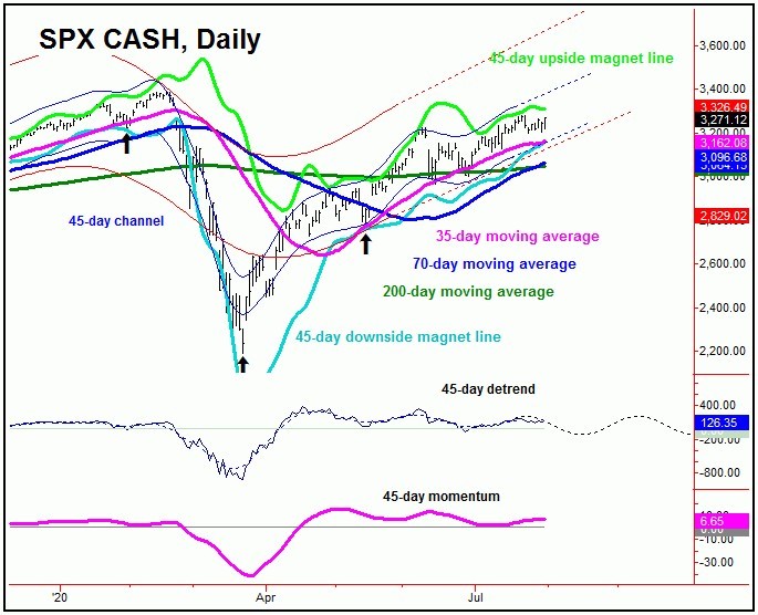 In terms of time, the next low for this 45-day component is projected for mid-to-late August, with the ideal path looking for a drop back to the 35-day moving average or lower. In terms of price, until a higher level materializes, we have a certain price figure that we are watching in order to confirm its downward phase to be back in force - which is the 3200.04 SPX CASH figure. Basically, above that number will keep the short-term uptrend intact, while below it would confirm a 45-day peak in place - and would call for additional correction into later this month.