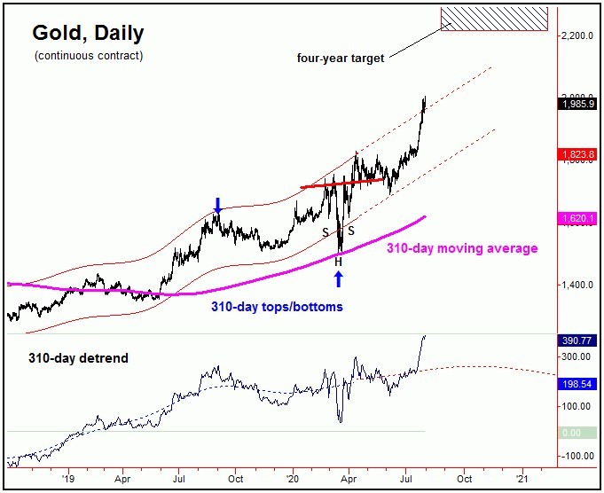 The above chart shows the smaller 310-day wave, with the four-year target overlaid. In terms of time, as mentioned above this target has the best odds of being met in the coming months, with the upper-end of this range (2340, plus or minus) also acting as a major resistance level for gold, and is the early odds-on favorite to top the move for what is expected to be a larger-degree decline into the Spring of next year.