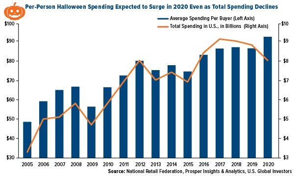 No surprise there. With many people still avoiding large gatherings due to the pandemic, and health officials calling trick-or-treating a “high-risk activity,” less is going to be spent on candy, costumes, party decorations and other Halloween-related items.