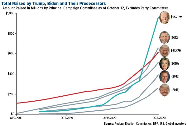 But we already knew that. For what it’s worth, Biden has raised more money than any other presidential candidate in U.S. history. As of October 12, his war chest stood at a head-spinning $952.2 million, which is one and a half times as much as President Donald Trump has raised over the same period.