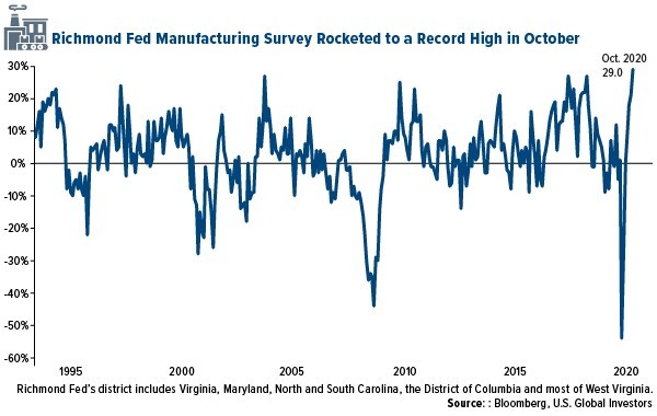 Also, manufacturing activity has been incredibly positive. The U.S. ISM Manufacturing PMI has been in expansionary mode for the past three months, and in October it registered a 59.3, the highest reading since September 2018. Last week, the manufacturing index for the Federal Reserve Bank of Richmond shows factories growing at a record pace. The index hit 29.0 in October, the highest reading going back to 1992.