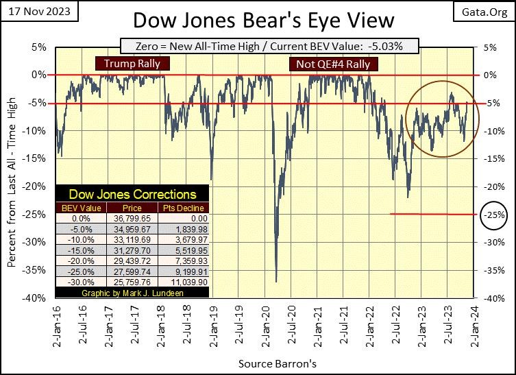 Still, the Dow Jones has been struggling since its last all-time high, the 04 January 2022 Terminal Zero of the Powell Not QE#4 market advance. Compare the last two years for the Dow Jones, with the Trump Rally above, where the Dow Jones closed in scoring position (BEV -0.01% to -4.99% / above its BEV -5% Red Line) and stayed there, making one new BEV Zero (new all-time high) after another for almost two years.