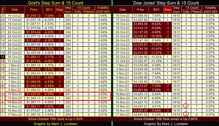 For gold in its step sum table below, since October 16th gold has seen no shortage of down days in its trading. But note during this time, since October 18th, gold closed in scoring position, except for the two days enclosed in a red box. Apparently, the goons at the COMEX aren’t having an easy time keeping the price of gold down.