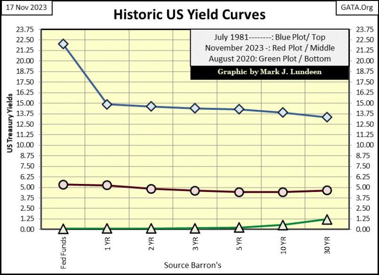 Below are some historic yield curves. The top Blue Plot was the largest yield inversion in the miserable history of the Federal Reserve. Double-digit CPI inflation of the late 1970s and early 1980s, drove Treasury Debt yields into double digits. In July 1981, when then FOMC primary idiot, Paul Volcker, increased his Fed Funds Rate to 22% to pop the bubble in consumer prices the FOMC had inflated into the economy. But this bubble wasn’t in the stock or bond market, but in consumer prices, which he was successful in popping a year later, because of what is seen below.