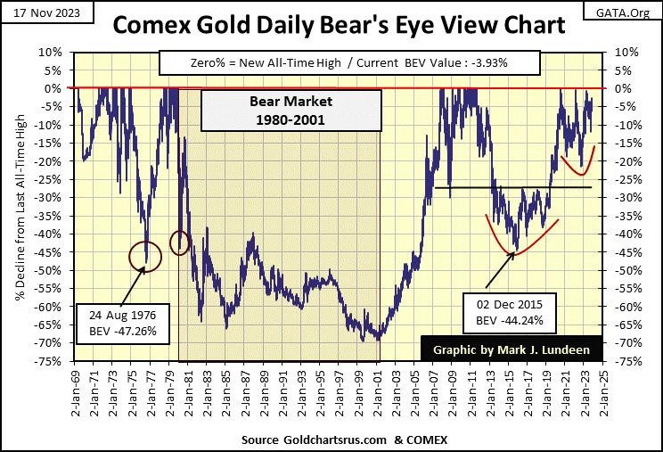 To go along with my chart of indexed values for gold and silver above, this week I’m publishing a BEV chart for gold that also goes back to 1969. Same data, the difference being the chart above is in indexed dollar valuations. The chart below is in Bear’s Eye View format; where each new all-time highs register as 0.00%, and never more. Any data point not a new all-time high, registers as a negative percentage claw back from their last all-time high, so;