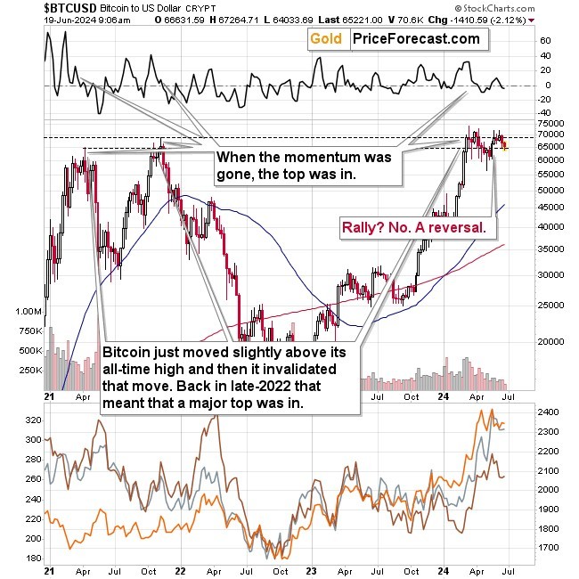 But… Could it be the case that bitcoin’s rally is over? It hasn’t moved to new highs after all, despite halving, which was supposed to ignite a powerful move up. It seemed like a sure bet, as it limits the supply of bitcoins. Instead, it triggered another attempt (!) to move to new highs – one that failed, too.
