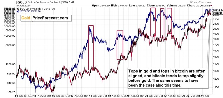 The late-2017 (bitcoin) and early-2018 top in gold perfectly correspond to this pattern. The same goes for the mid-2019 top. In case of the 2021 tops, the link is not as clear, but still we saw tops in bitcoin along with tops in gold, and the former topped earlier.