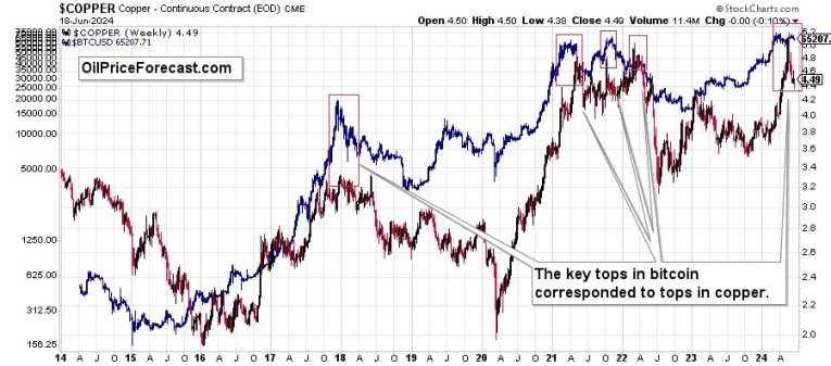 Interestingly, in late 2017 and in early 2021, bitcoin topped slightly before copper did, and in late-2021, bitcoin topped a bit later.