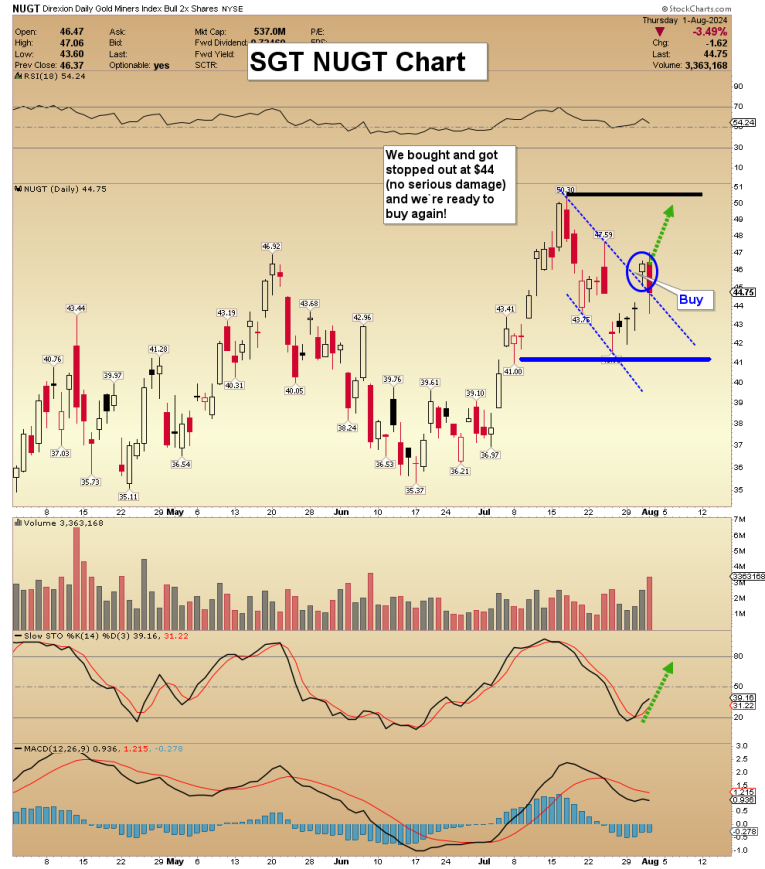 At my SGT Super Gold Trader newsletter, Traders make plays on NUGT, DUST, JNUG, UCO, and other key leveraged ETFs, as well as some individual stocks. Tight stoplosses on every trade keep drawdowns in check. The SGS proprietary signals are the core of the service. At $499/yr, subs love the action, and I have a half price $249/14mth special offer this week! If you want the offer, please send me an email or click this link and I’ll make it happen. Thanks!