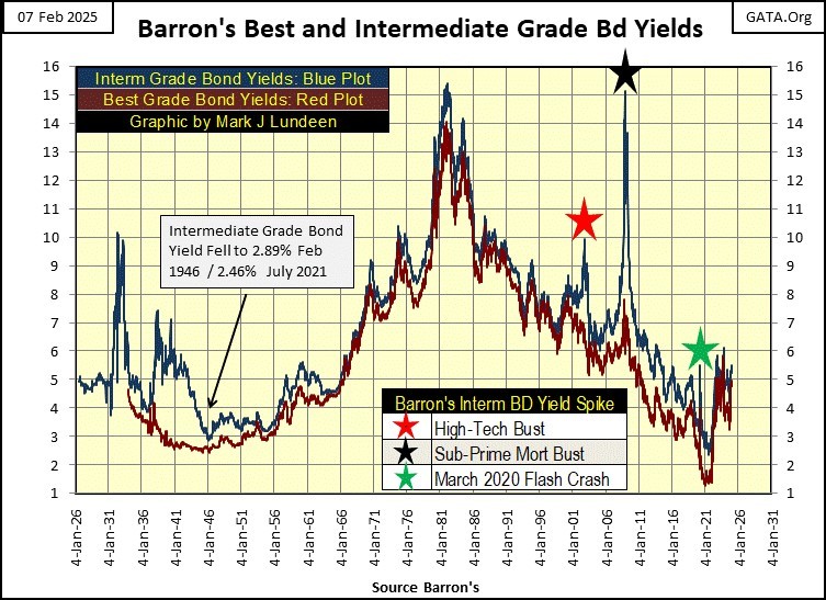 What is the key to understand when gold and silver mining stocks will under, or over perform the general market? Trends in bond yields, as seen below with Barron’s Best and Intermediate Grade Corporate Bond Yields.