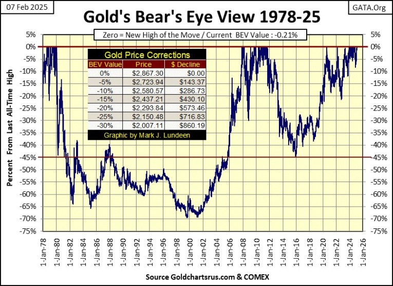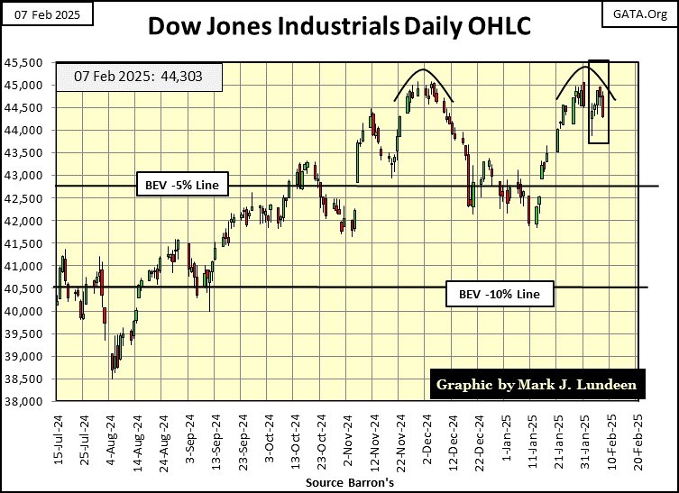But then, should the Dow Jones begin to see daily closings with BEV values below -5.0%, say like BEVs of -7.0% or deeper, that could be trouble. And for a close with the Dow Jones below a BEV of -10%, I recommend exiting the market, and going into cash. Or better yet, placing a good portion of your holdings in precious metal assets.