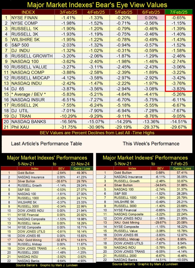I follow twenty major market indexes seen below, which I use their BEV values to more easily compare their performance to each other. I really don’t care about their prices. Knowing which one is seeing a new all-time high this week, as the NYSE Financial Index did on Thursday this week (0.00%), or how far, in percentage terms, the other indexes are from their last all-time highs, seems a more valuable insight into each market index below, and the market as a whole.