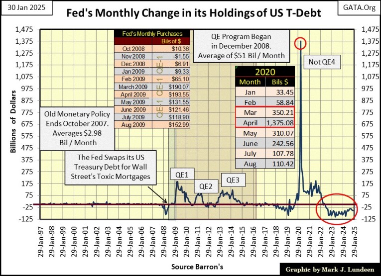 The Federal Reserve creates from nothing, as many dollars as it wants, whenever it wants. Looking at a chart of monthly changes in the Federal Reserve’s balance sheet below; previously to November 2007, the Fed averaged 2.98 billion dollars of monetary inflation per month since January 1997. This was sufficient monetary inflation to inflate massive bubbles in the NASDAQ High-Tech stocks (1992 to 2000), and Sub-Prime Mortgage market (2002 – 2007).