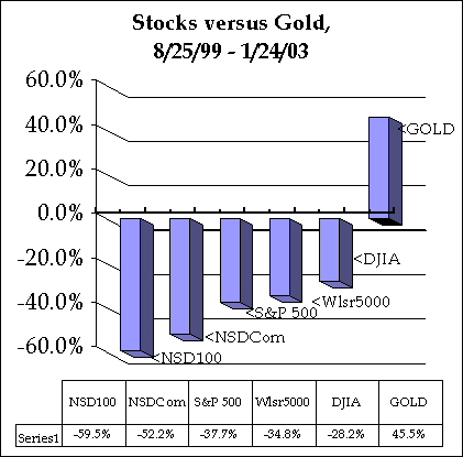 Finally, here's an answer for people who bought silver a year ago and are miffed because it only promised higher prices without delivering. Look at the chart, Stocks versus Silver, June 7, 2001 - January 24, 2003. During that time silver has posted a meagre 12.8% gain, while the Dow has dropped 26.7%. So, I will step up to the line and admit that your silver has certainly not set the world on fire yet. But if you had sold your Dow stocks in June 2001 and put the proceeds into silver, you would be 39.5% better off today. If you had sold your Nasdaq 100 stocks for silver, you'd be 62.1% better off.