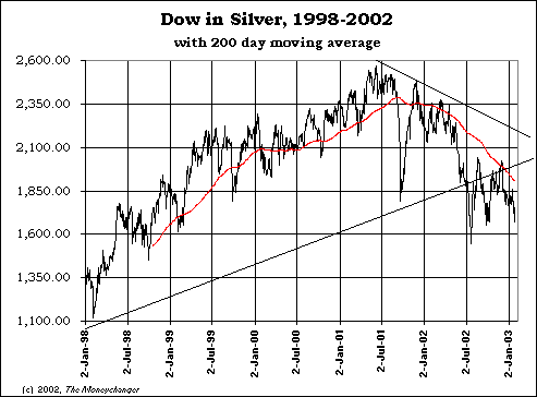 On 1/24/03 with silver at $4.875 and the Dow at 8,131.02, it took 1,667.9 ounces of silver to buy the Dow.