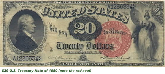 To be sure, as the notes issued during earlier times wore out, they were replaced by newly printed notes. Hence, I display a couple of U.S. Treasury notes issued in 1880. With these notes, the legal tender quality of the note is printed on the front, in small letters, within the top margin.