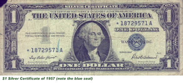 In contrast, the $1 silver certificate of 1957 promises the bearer only One Dollar In Silver. When the government announced that it would stop paying out silver on these certificates, and many people queued up to get their silver, many of them were given, not silver dollars, but little bags of silver dust.