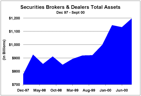 If Greenspan truly believes that the explosion in financial sector liabilities is mitigated -“many of the larger risks are dramatically – or, I should say, fully hedged” - by sophisticated derivatives and hedging strategies, lord help us all. Interestingly, but not surprisingly, the collapse of the technology bubble and the faltering junk bond market has led Wall Street to “circle the wagons.” Almost without exception, the key players in the Wall Street Credit Machine have experienced strong stock prices. We see that the AMEX Securities Broker/Dealer index gained 26% this year. Fannie Mae jumped 40% and Freddie Mac 46%. Credit insurer MBIA gained 40% and Ambac surged 67%. Aggressive consumer lenders Providian gained 26% and Capital One 37%. Investment management companies Alliance Capital gained 69% and Franklin Resources 19%. With Wall Street at the helm of this dysfunctional system, lavish rewards continue to fall to those perpetuating credit bubble excess.
