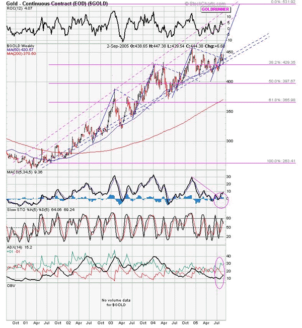 The next chart is a linear chart showing Gold's unceasing march, upward. Since this chart is linear we might expect Gold's price action to move in an upward parabolic fashion at some point in time. Notice that Gold has corrected back to the tend line, then, lifted off of it. This is what we have expected, in fact, the second dotted trend line was recently touched right on cue. Notice that the MACD is rising, supported by a rising ADX line that suggests a trending movement is at hand. Also, it seems that the longer the time of correction in this chart, the larger the next move, upward. IMO, it is time to say "Goodbye" to Falcor's line in the sand. Gold $530ish, here we come.