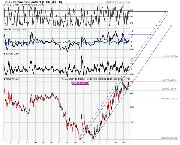 The first chart simulates Falcor III's chart of Gold's line in the sand. Since 1981 the price of Gold has not traded above the thicker, top, dark blue line. Should Gold move above such an important time-held barrier, we might find that the first inklings of a move toward a monetary role for Gold is once again upon us. Could it be that the big wind that caused so much destruction in the Southeast United States might have blown the line in the sand, away. A break of the line might quickly take the price of gold above $500. Life is very fragile from all perspectives, and just a disgusting gust is all it takes.