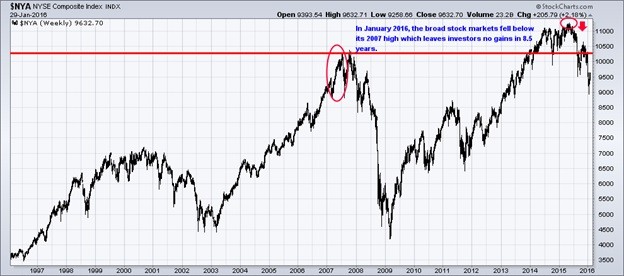 In January 2016, the broad stock markets fell below its 2007 high which means investors have zero gains over the last 8.5 years.