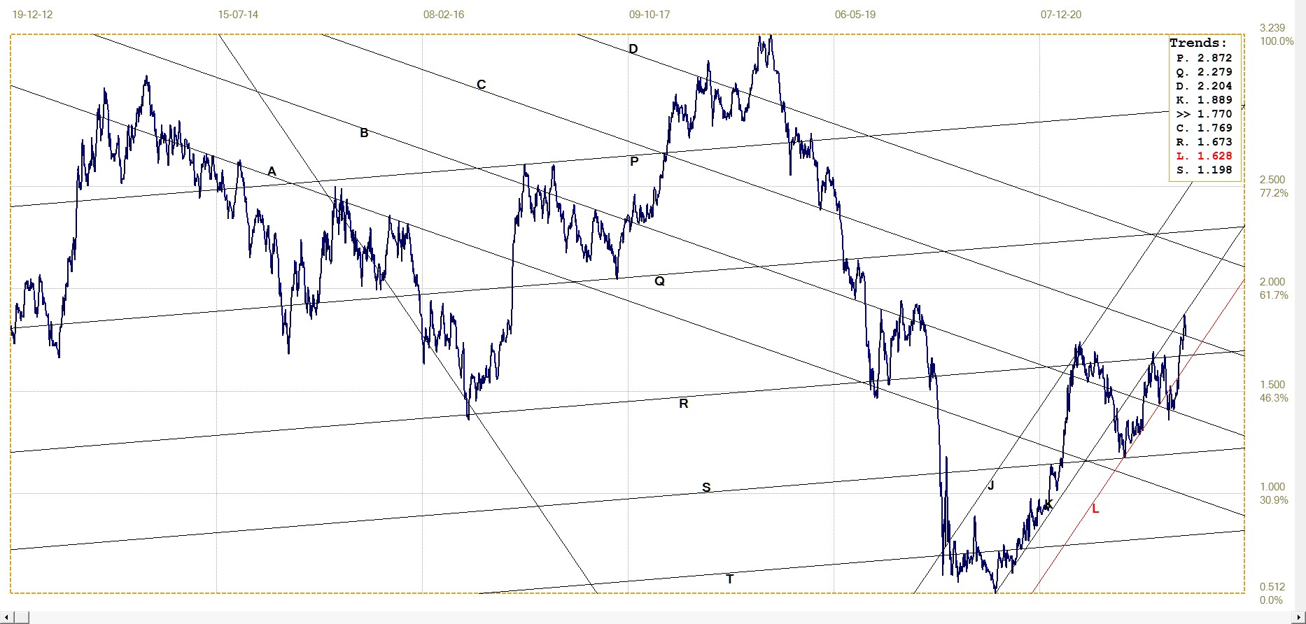 The earlier ceiling price of $1800 was breached but, as month end nears, anything can still happen. After several tests of the support along the bottom of bull channel BC, the price managed to break back into the steeper bull channel PQ. While this is a positive signal, strong resistance at line W, top of megaphone WV, still lies ahead.