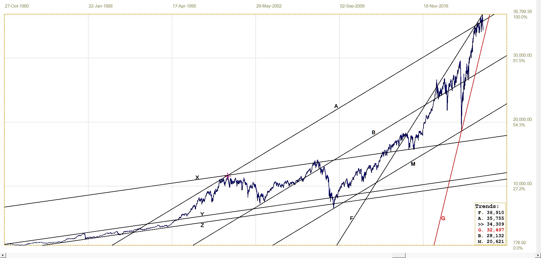 Alternatively, the DJIA can now break lower before reaching line F to complete leg 4. That would be a premature or abnormal break from the rising wedge, which normally will be a very bearish signal once it breaks below steep line G, currently at 32 497.