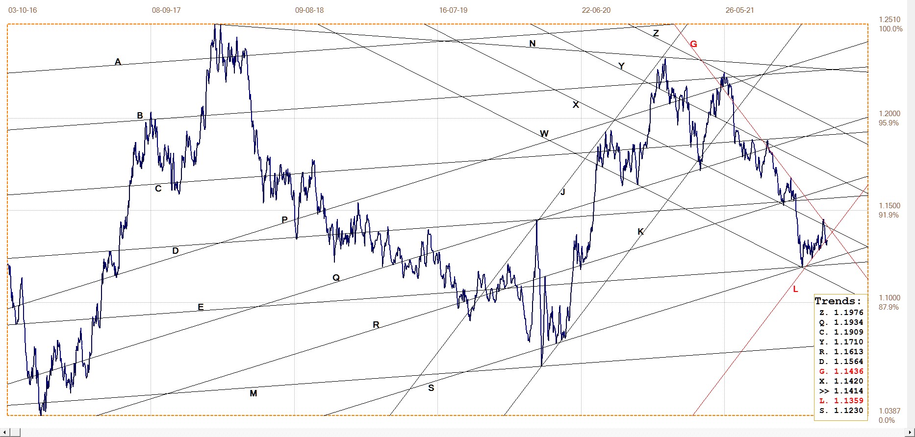The options at the moment are that the DJIA completes leg three by rebounding off line G into leg five, which later is to be completed by touching line F. Then the DJIA can either proceed normally and complete the downward leg five and break below line G into a new bear market. After starting on leg five off line F, the DJIA can break higher before leg five is completed, which would be very bullish.