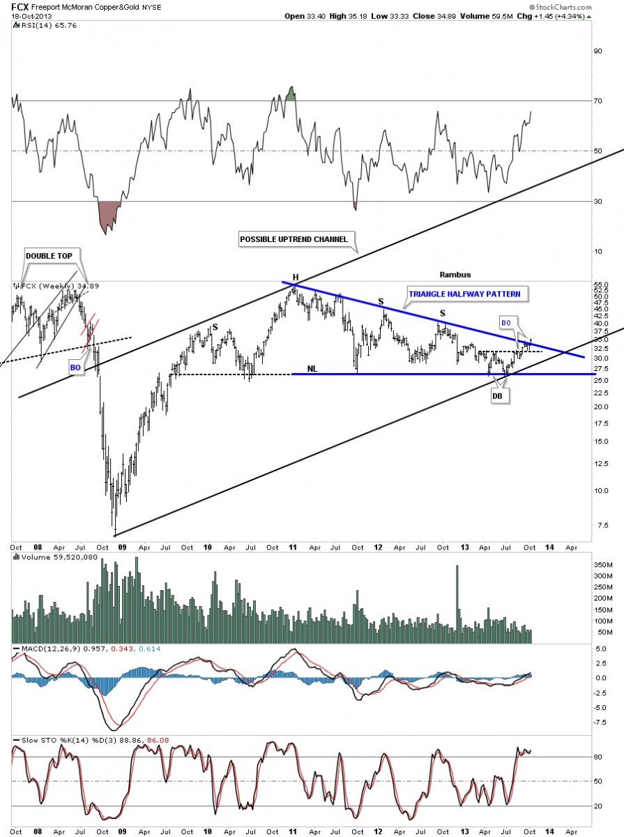 Lets look at one more big miner FCX that is actually breaking through the top rail of its now morphing H&S – triangle pattern. I’ve left the original annotation on this weekly chart that shows how the H&S looked in conjunction with the blue triangle. Note the small double bottom that formed on the right side of the chart that has led to the breakout of the top blue rail.