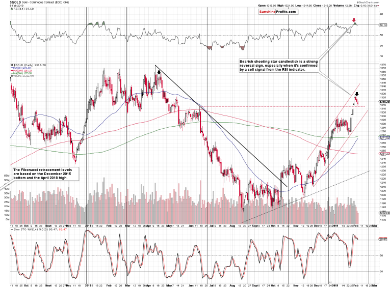 Silver moved above the early 2019 high, but not significantly so, and right now it’s back below the early-January intraday high. The only similar situation is what happened in early 2018. That’s when silver moved briefly above the previous local highs, topped (higher silver prices were never seen since that top), and then declined in a quite specific manner.