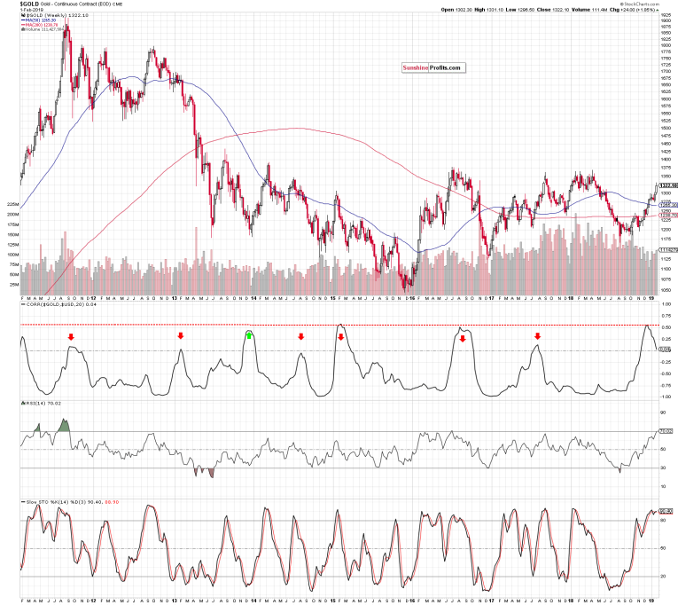Positive correlation means that both are moving in the same direction. The red line represents the extremes of tightness of mutual movements - we have one instance almost touching it in Dec 2013, one in Feb 2015, one in Aug 2016 and finally now. Only the first one (end of 2013) resulted in gold price upswing (that was eventually reversed though) - the other two marked a sharp or prolonged top followed by declines. Currently, the top in positive correlation looks to be in but the price has not yet followed it down. Should it be a cause for concern? Not really, as it is not necessarily a precise timing tool – it works best in catching the direction of the next move right. Take a look at the similar situation in Q3 2016 when we first got a gold price upswing and only then the fall.
