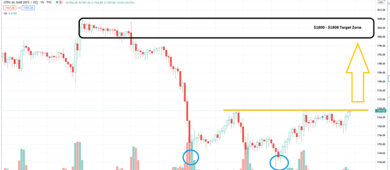 The price action is positive, and a rally to my target zone of $1800-$1808 seems imminent.